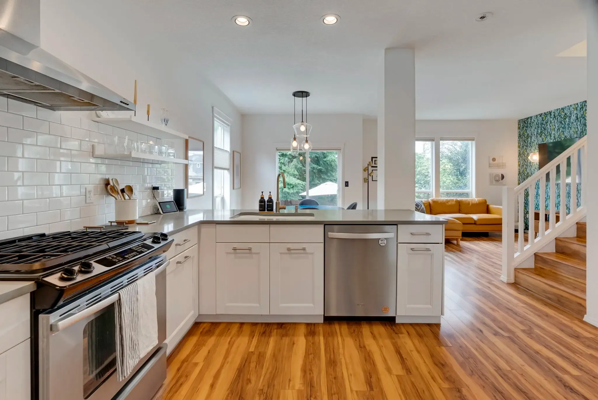 A rare chance to live in a beautifully designed home in the center of one of the most adored neighborhoods in PDX. This impeccably updated four-bedroom townhome combines clean, modern lines with thoughtful functionality. Step inside and discover a light-filled home with soaring ceilings and a cozy gas fireplace, creating the perfect space to relax or entertain. Tall ceilings and large windows fill the home with natural light, creating an inviting and airy atmosphere. The open concept living area flows seamlessly into the dining area and stunning kitchen with quartz countertops, stainless steel appliances, gas range, and peninsula seating, perfect for entertaining or everyday living.